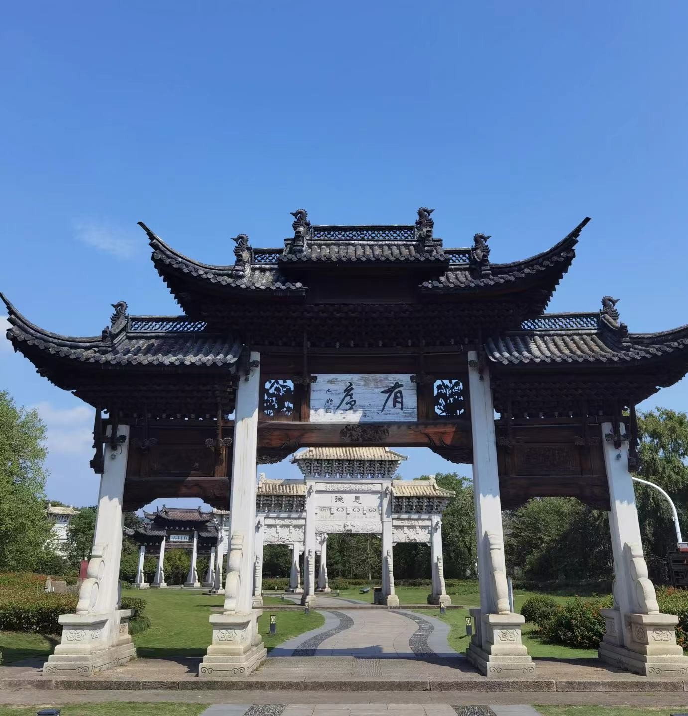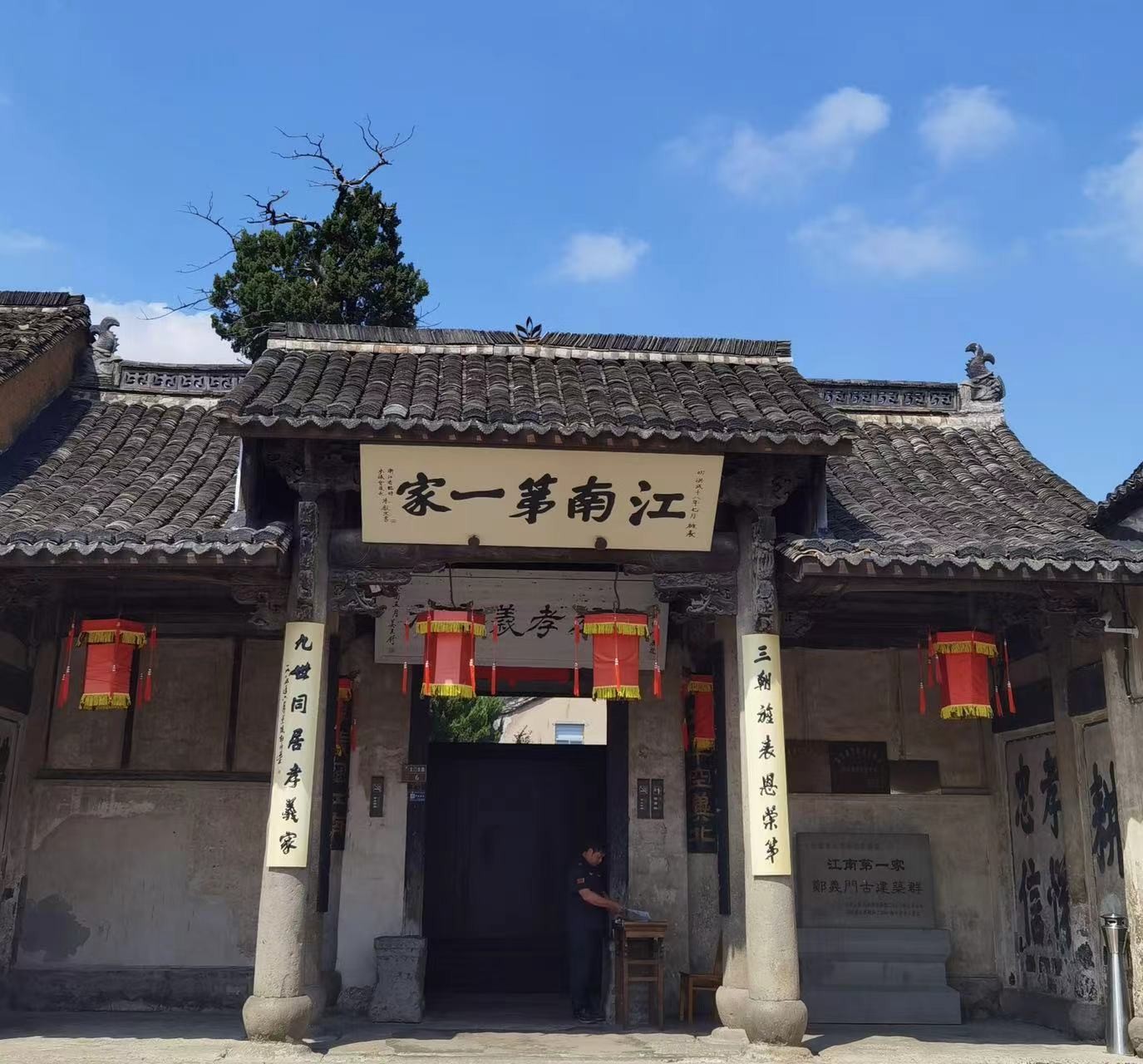 随后工作人员带大家到牌坊群和郑氏宗祠景点参观。牌坊共有九座,依次称江南第一家、孝义门、三朝旌表、有序、恩德、麟凤、取义成仁、礼部尚书和九世同居。郑氏宗祠占地面积6600多平方米,始建于南宋中叶,经元、明、清三朝数度扩建,成为一座规模宏大、古朴庄严、气势雄伟、风格独具的建筑,迄今已有八百余年的历史。 郑氏宗祠内高悬众多“孝义家”、“孝友堂”、“有序”、“师俭”等题匾和联语等,具有很高的艺术价值和文物价值。悠久的历史,深厚灿烂的文化,优美的自然景观,丰富的历史遗迹,无愧为“江南第一家”。